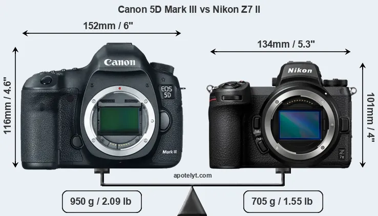 The physical size and weight of the Canon 5D Mark III and the Nikon Z7 II are illustrated in the side-by-side display below. The two cameras are presented according to their relative size. Three consecutive views from the front, the top, and the rear side are shown. All size dimensions are rounded to the nearest millimeter.
