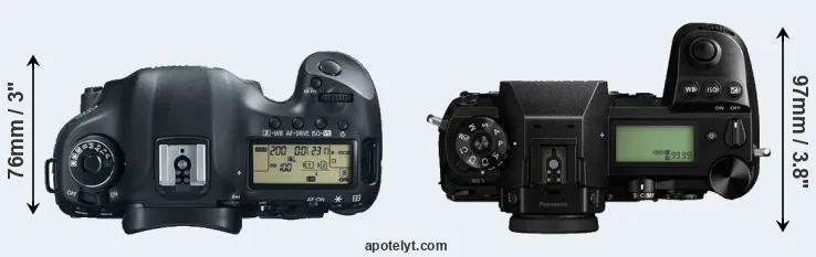 An illustration of the physical size and weight of the Canon 5D Mark III and the Panasonic S1 is provided in the side-by-side display below. The two cameras are presented according to their relative size. Three consecutive perspectives from the front, the top, and the back are available. All width, height and depth dimensions are rounded to the nearest millimeter.