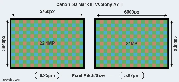 Despite having a slightly smaller sensor, the A7 II offers a slightly higher resolution of 24 megapixels, compared with 22.1 MP of the 5D Mark III. This megapixels advantage comes at the cost of a higher pixel density and a smaller size of the individual pixel (with a pixel pitch of 5.97μm versus 6.25μm for the 5D Mark III). However, it should be noted that the A7 II is much more recent (by 2 years and 8 months) than the 5D Mark III, and its sensor will have benefitted from technological advances during this time that make it possible to gather light more efficiently.