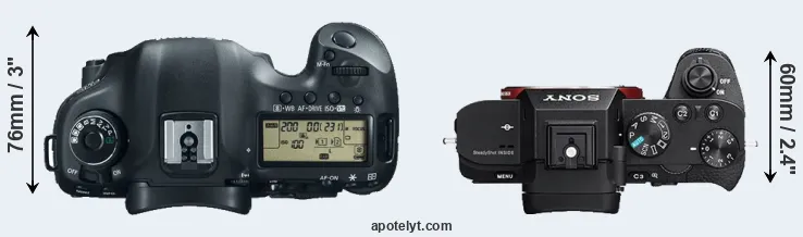 The physical size and weight of the Canon 5D Mark III and the Sony A7 II are illustrated in the side-by-side display below. The two cameras are presented according to their relative size. Three consecutive views from the front, the top, and the rear side are shown. All size dimensions are rounded to the nearest millimeter.