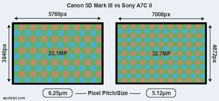 Despite having a slightly smaller sensor, the A7C II offers a higher resolution of 32.7 megapixels, compared with 22.1 MP of the 5D Mark III. This megapixels advantage comes at the cost of a higher pixel density and a smaller size of the individual pixel (with a pixel pitch of 5.12μm versus 6.25μm for the 5D Mark III). However, it should be noted that the A7C II is much more recent (by 11 years and 5 months) than the 5D Mark III, and its sensor will have benefitted from technological advances during this time that make it possible to gather light more efficiently. Coming back to sensor resolution, it should be mentioned that the A7C II has no anti-alias filter installed, so that it can capture all the detail its sensor resolves.