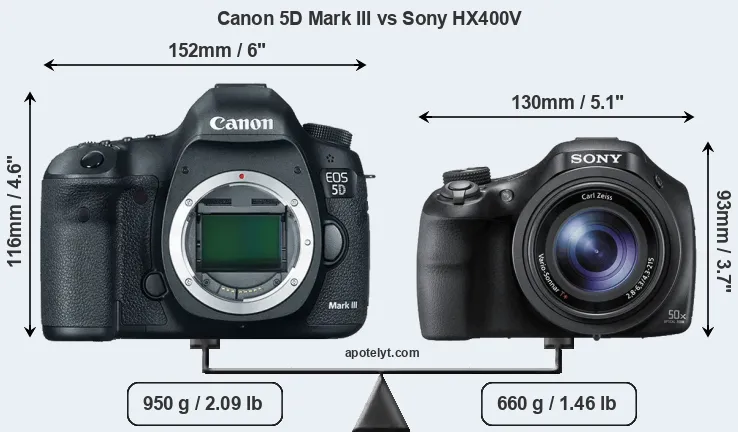 An illustration of the physical size and weight of the Canon 5D Mark III and the Sony HX400V is provided in the side-by-side display below. The two cameras are presented according to their relative size. Three successive views from the front, the top, and the rear are shown. All width, height and depth measures are rounded to the nearest millimeter.