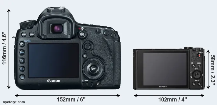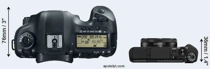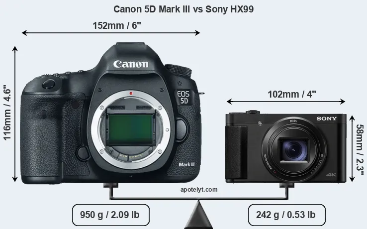 The side-by-side display below illustrates the physical size and weight of the Canon 5D Mark III and the Sony HX99. The two cameras are presented according to their relative size. Three successive views from the front, the top, and the rear are shown. All width, height and depth measures are rounded to the nearest millimeter.