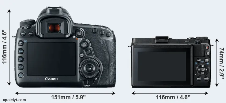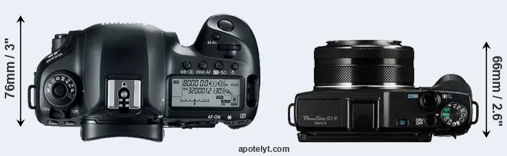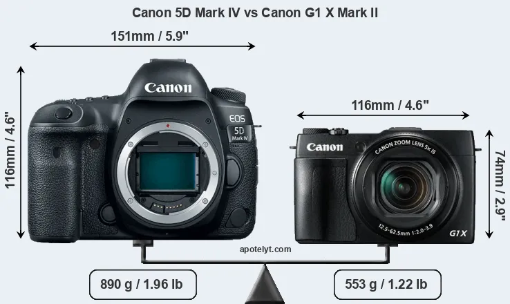 The physical size and weight of the Canon 5D Mark IV and the Canon G1 X Mark II are illustrated in the side-by-side display below. The two cameras are presented according to their relative size. Three consecutive views from the front, the top, and the rear side are shown. All width, height and depth measures are rounded to the nearest millimeter.