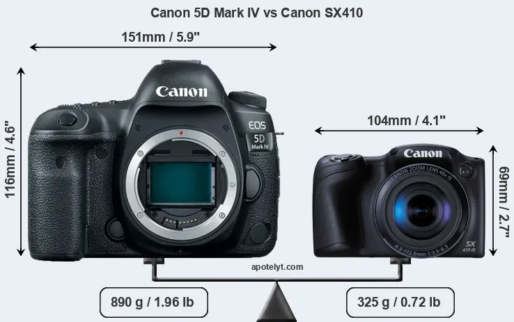 The physical size and weight of the Canon 5D Mark IV and the Canon SX410 are illustrated in the side-by-side display below. The two cameras are presented according to their relative size. Three successive views from the front, the top, and the rear are shown. All width, height and depth measures are rounded to the nearest millimeter.