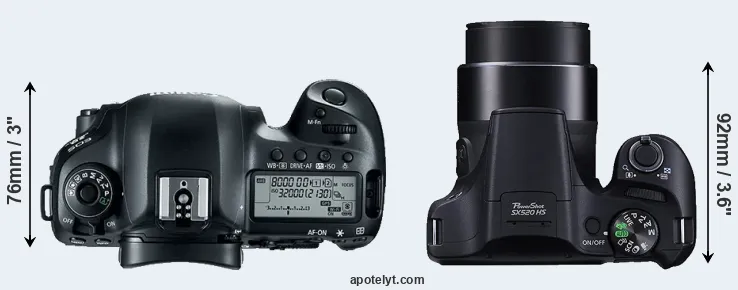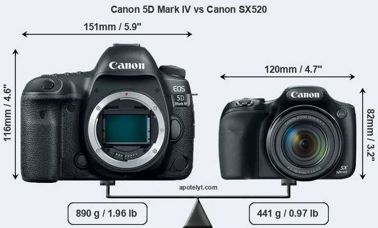 The physical size and weight of the Canon 5D Mark IV and the Canon SX520 are illustrated in the side-by-side display below. The two cameras are presented according to their relative size. Three consecutive views from the front, the top, and the rear side are shown. All size dimensions are rounded to the nearest millimeter.
