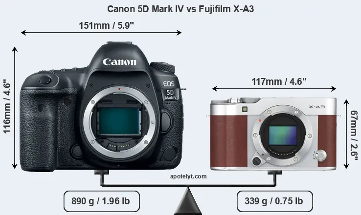An illustration of the physical size and weight of the Canon 5D Mark IV and the Fujifilm X-A3 is provided in the side-by-side display below. The two cameras are presented according to their relative size. Three successive views from the front, the top, and the rear are shown. All size dimensions are rounded to the nearest millimeter.