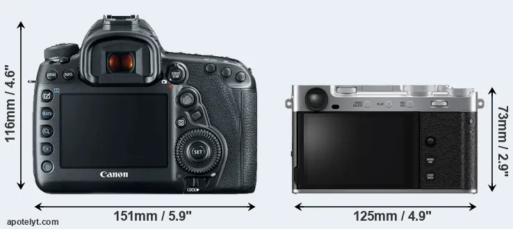 The physical size and weight of the Canon 5D Mark IV and the Fujifilm X-E5 are illustrated in the side-by-side display below. The two cameras are presented according to their relative size. Three successive views from the front, the top, and the rear are shown. All width, height and depth measures are rounded to the nearest millimeter.