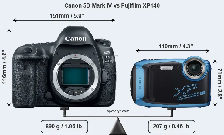 The physical size and weight of the Canon 5D Mark IV and the Fujifilm XP140 are illustrated in the side-by-side display below. The two cameras are presented according to their relative size. Three successive views from the front, the top, and the rear are shown. All width, height and depth measures are rounded to the nearest millimeter.