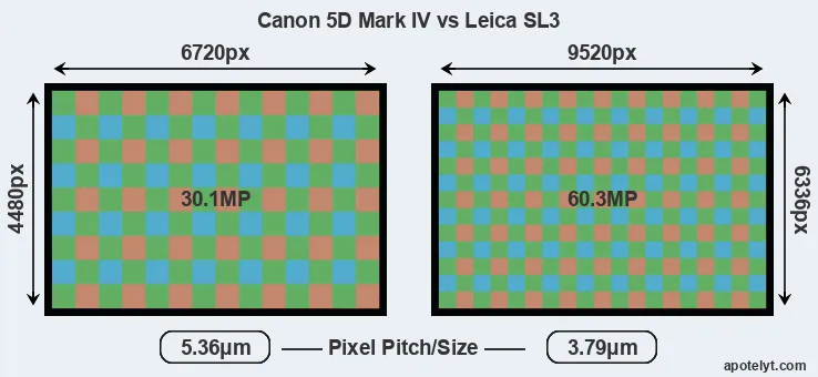 While the two cameras under review share the same sensor size, the Leica SL3 offers a higher resolution of 60.3 megapixels, compared with 30.1 MP of the 5D Mark IV. This megapixels advantage translates into a 42 percent gain in linear resolution. On the other hand, these sensor specs imply that the Leica SL3 has a higher pixel density and a smaller size of the individual pixel (with a pixel pitch of 3.79μm versus 5.36μm for the 5D Mark IV). However, it should be noted that the Leica SL3 is much more recent (by 7 years and 6 months) than the 5D Mark IV, and its sensor will have benefitted from technological advances during this time that compensate for the smaller pixel size. Coming back to sensor resolution, it should be mentioned that the Leica SL3 has no anti-alias filter installed, so that it can capture all the detail its sensor resolves.