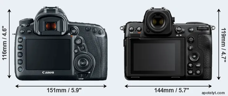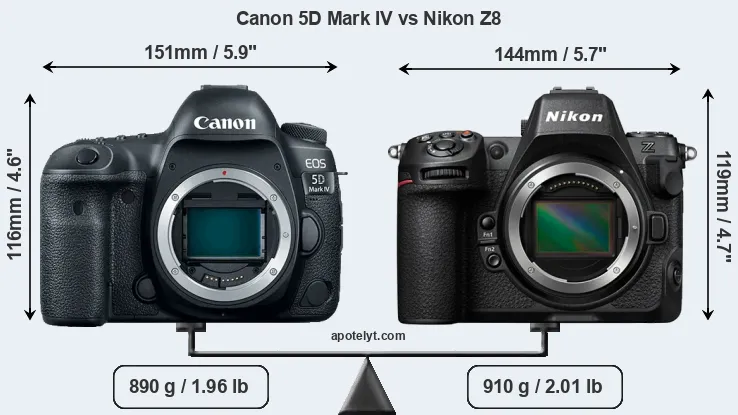The physical size and weight of the Canon 5D Mark IV and the Nikon Z8 are illustrated in the side-by-side display below. The two cameras are presented according to their relative size. Three consecutive perspectives from the front, the top, and the back are available. All width, height and depth dimensions are rounded to the nearest millimeter.