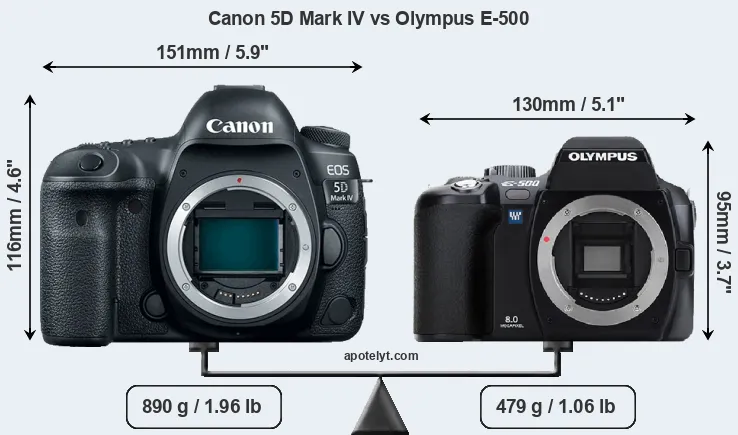 The side-by-side display below illustrates the physical size and weight of the Canon 5D Mark IV and the Olympus E-500. The two cameras are presented according to their relative size. Three successive views from the front, the top, and the rear are shown. All width, height and depth dimensions are rounded to the nearest millimeter.