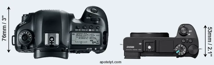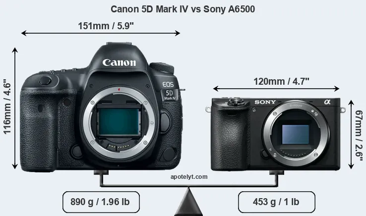 An illustration of the physical size and weight of the Canon 5D Mark IV and the Sony A6500 is provided in the side-by-side display below. The two cameras are presented according to their relative size. Three successive views from the front, the top, and the rear are shown. All size dimensions are rounded to the nearest millimeter.