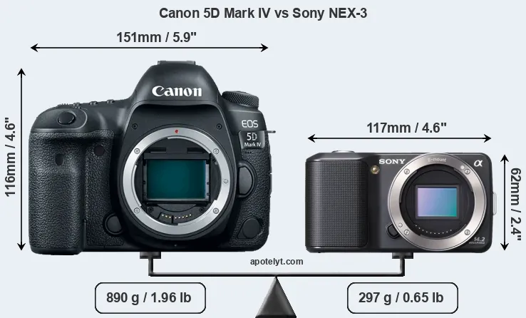 The physical size and weight of the Canon 5D Mark IV and the Sony NEX-3 are illustrated in the side-by-side display below. The two cameras are presented according to their relative size. Three consecutive perspectives from the front, the top, and the back are available. All width, height and depth dimensions are rounded to the nearest millimeter.