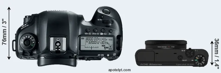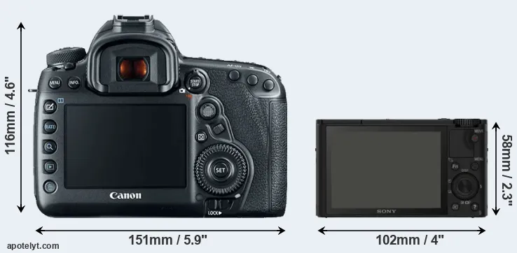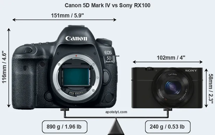 The side-by-side display below illustrates the physical size and weight of the Canon 5D Mark IV and the Sony RX100. The two cameras are presented according to their relative size. Three consecutive views from the front, the top, and the rear side are shown. All width, height and depth measures are rounded to the nearest millimeter.