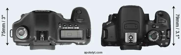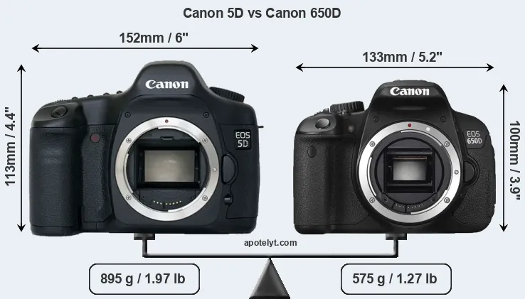 The side-by-side display below illustrates the physical size and weight of the Canon 5D and the Canon 650D. The two cameras are presented according to their relative size. Three consecutive perspectives from the front, the top, and the back are available. All width, height and depth measures are rounded to the nearest millimeter.