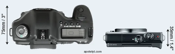 The side-by-side display below illustrates the physical size and weight of the Canon 5D and the Canon M100. The two cameras are presented according to their relative size. Three consecutive views from the front, the top, and the rear side are shown. All size dimensions are rounded to the nearest millimeter.