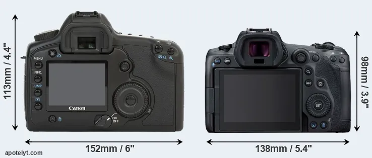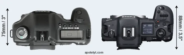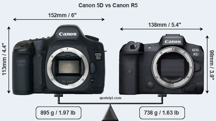 An illustration of the physical size and weight of the Canon 5D and the Canon R5 is provided in the side-by-side display below. The two cameras are presented according to their relative size. Three consecutive perspectives from the front, the top, and the back are available. All size dimensions are rounded to the nearest millimeter.