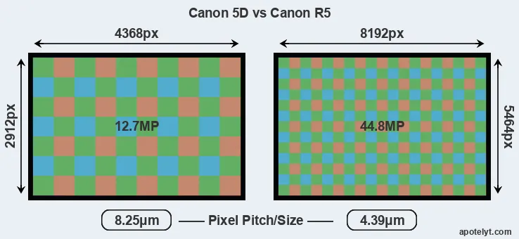 While the two cameras under review share the same sensor size, the R5 offers a higher resolution of 44.8 megapixels, compared with 12.7 MP of the 5D. This megapixels advantage translates into a 88 percent gain in linear resolution. On the other hand, these sensor specs imply that the R5 has a higher pixel density and a smaller size of the individual pixel (with a pixel pitch of 4.39μm versus 8.25μm for the 5D). However, it should be noted that the R5 is much more recent (by 14 years and 11 months) than the 5D, and its sensor will have benefitted from technological advances during this time that compensate for the smaller pixel size.