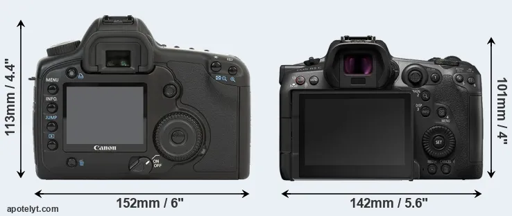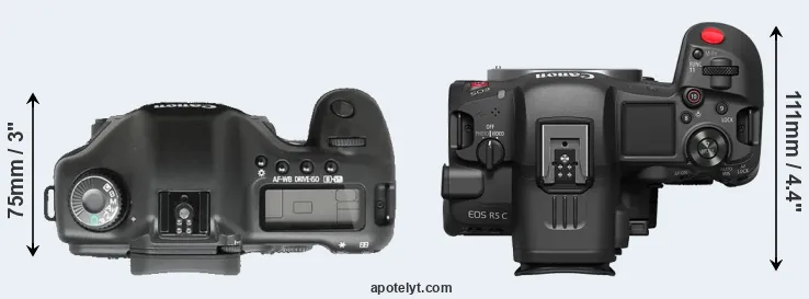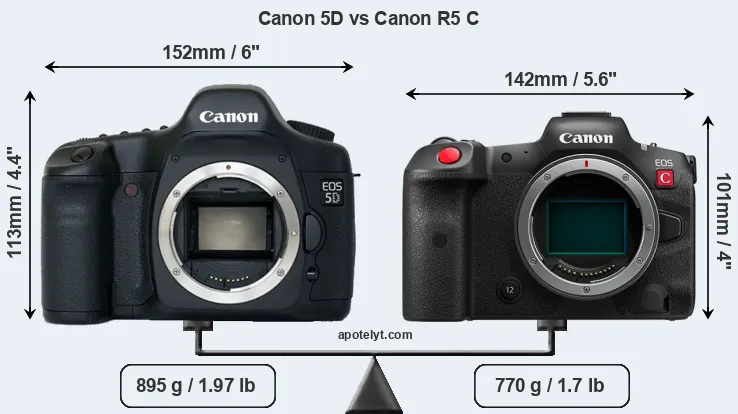 The side-by-side display below illustrates the physical size and weight of the Canon 5D and the Canon R5 C. The two cameras are presented according to their relative size. Three consecutive views from the front, the top, and the rear side are shown. All width, height and depth dimensions are rounded to the nearest millimeter.