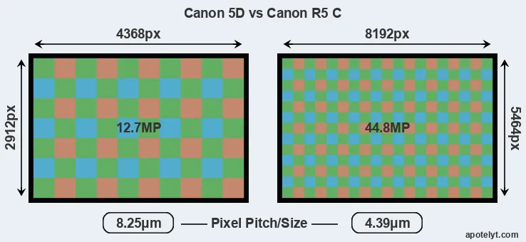 While the two cameras under review share the same sensor size, the R5 C offers a higher resolution of 44.8 megapixels, compared with 12.7 MP of the 5D. This megapixels advantage translates into a 88 percent gain in linear resolution. On the other hand, these sensor specs imply that the R5 C has a higher pixel density and a smaller size of the individual pixel (with a pixel pitch of 4.39μm versus 8.25μm for the 5D). However, it should be noted that the R5 C is much more recent (by 16 years and 5 months) than the 5D, and its sensor will have benefitted from technological advances during this time that compensate for the smaller pixel size.