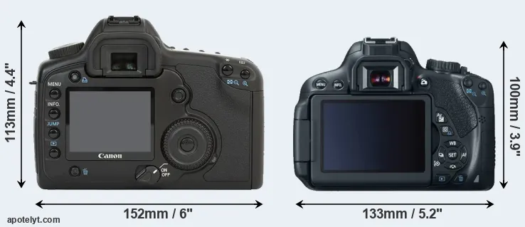 The side-by-side display below illustrates the physical size and weight of the Canon 5D and the Canon T4i. The two cameras are presented according to their relative size. Three consecutive perspectives from the front, the top, and the back are available. All width, height and depth measures are rounded to the nearest millimeter.