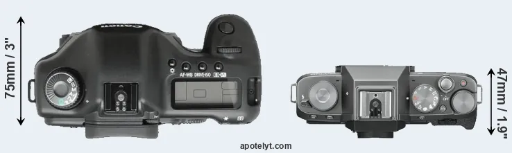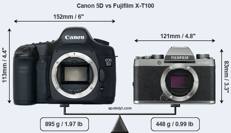 The physical size and weight of the Canon 5D and the Fujifilm X-T100 are illustrated in the side-by-side display below. The two cameras are presented according to their relative size. Three successive views from the front, the top, and the rear are shown. All width, height and depth dimensions are rounded to the nearest millimeter.