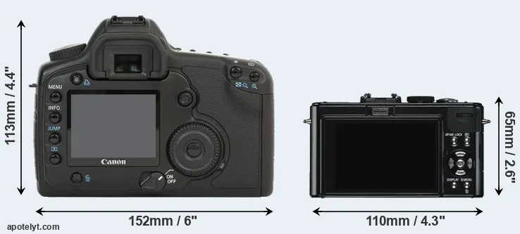 The above size and weight comparisons are to some extent incomplete and possibly misleading, as the D-LUX 5 has a lens built in, whereas the 5D is an interchangeable lens camera that requires a separate lens. Attaching the latter will add extra weight and bulk to the setup. You can compare the optics available for the 5D and their specifications in the Canon EF Lens Catalog.