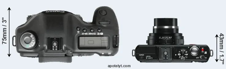The side-by-side display below illustrates the physical size and weight of the Canon 5D and the Leica D-LUX 5. The two cameras are presented according to their relative size. Three consecutive views from the front, the top, and the rear side are shown. All size dimensions are rounded to the nearest millimeter.