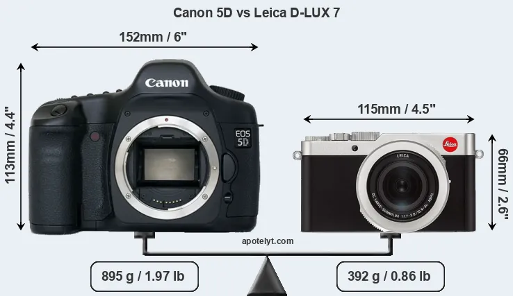 If the front view area (width x height) of the cameras is taken as an aggregate measure of their size, the Leica D-LUX 7 is considerably smaller (56 percent) than the Canon 5D. It is worth mentioning in this context that the 5D is splash and dust resistant, while the D-LUX 7 does not feature any corresponding weather-sealing.
