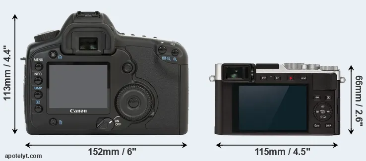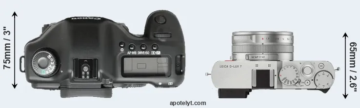 The side-by-side display below illustrates the physical size and weight of the Canon 5D and the Leica D-LUX 7. The two cameras are presented according to their relative size. Three consecutive views from the front, the top, and the rear side are shown. All width, height and depth measures are rounded to the nearest millimeter.