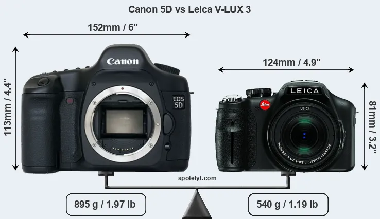 The side-by-side display below illustrates the physical size and weight of the Canon 5D and the Leica V-LUX 3. The two cameras are presented according to their relative size. Three consecutive views from the front, the top, and the rear side are shown. All width, height and depth dimensions are rounded to the nearest millimeter.