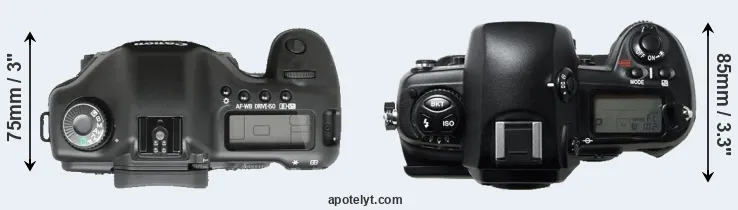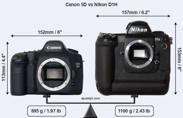 An illustration of the physical size and weight of the Canon 5D and the Nikon D1H is provided in the side-by-side display below. The two cameras are presented according to their relative size. Three successive views from the front, the top, and the rear are shown. All width, height and depth dimensions are rounded to the nearest millimeter.