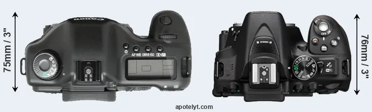 The side-by-side display below illustrates the physical size and weight of the Canon 5D and the Nikon D5300. The two cameras are presented according to their relative size. Three consecutive perspectives from the front, the top, and the back are available. All width, height and depth measures are rounded to the nearest millimeter.
