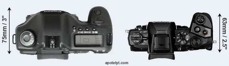 The side-by-side display below illustrates the physical size and weight of the Canon 5D and the Olympus E-M1. The two cameras are presented according to their relative size. Three consecutive perspectives from the front, the top, and the back are available. All width, height and depth measures are rounded to the nearest millimeter.
