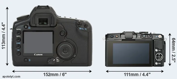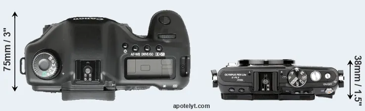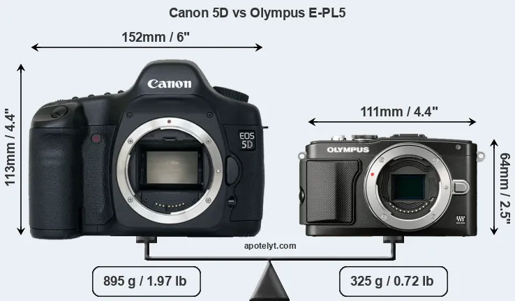 The side-by-side display below illustrates the physical size and weight of the Canon 5D and the Olympus E-PL5. The two cameras are presented according to their relative size. Three consecutive views from the front, the top, and the rear side are shown. All width, height and depth dimensions are rounded to the nearest millimeter.