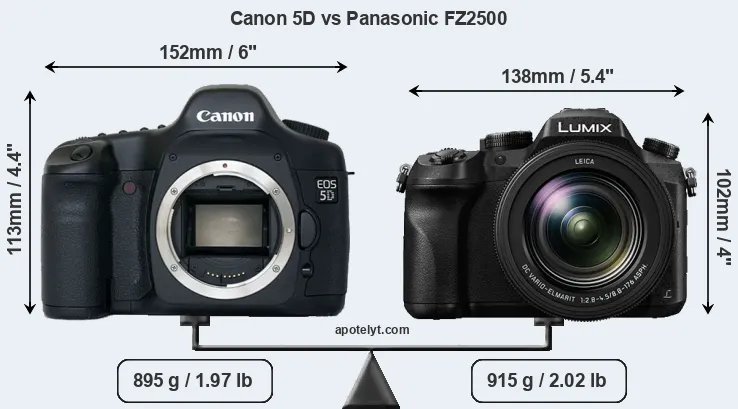 An illustration of the physical size and weight of the Canon 5D and the Panasonic FZ2500 is provided in the side-by-side display below. The two cameras are presented according to their relative size. Three successive views from the front, the top, and the rear are shown. All width, height and depth dimensions are rounded to the nearest millimeter.
