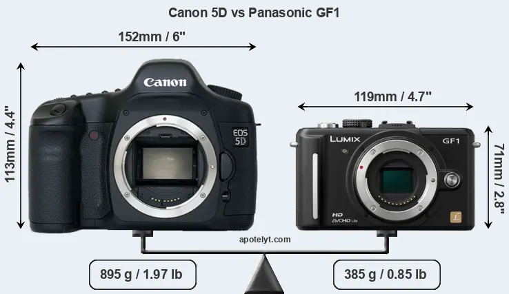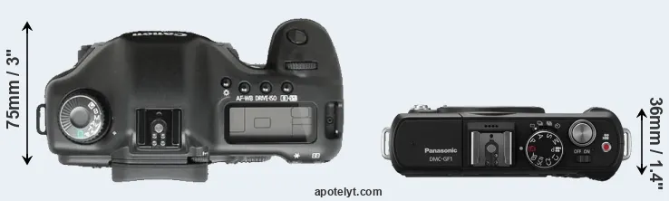 The side-by-side display below illustrates the physical size and weight of the Canon 5D and the Panasonic GF1. The two cameras are presented according to their relative size. Three successive views from the front, the top, and the rear are shown. All width, height and depth dimensions are rounded to the nearest millimeter.