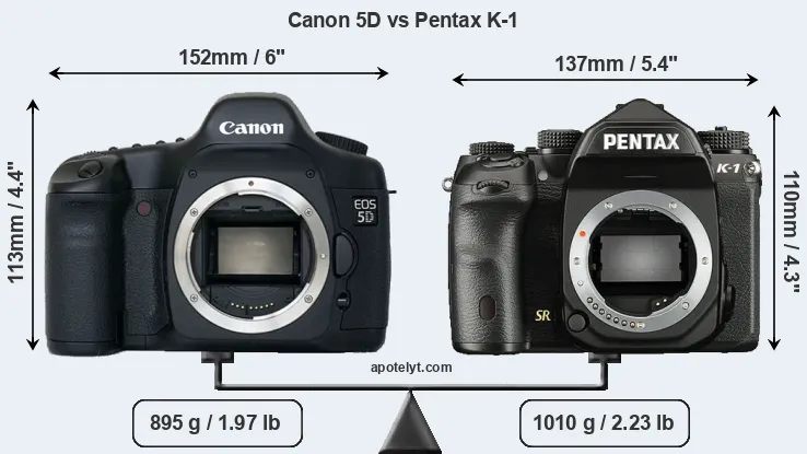An illustration of the physical size and weight of the Canon 5D and the Pentax K-1 is provided in the side-by-side display below. The two cameras are presented according to their relative size. Three successive views from the front, the top, and the rear are shown. All width, height and depth measures are rounded to the nearest millimeter.