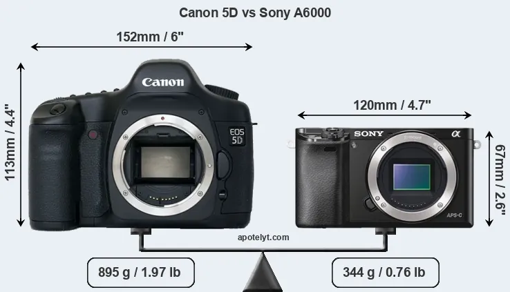 If the front view area (width x height) of the cameras is taken as an aggregate measure of their size, the Sony A6000 is considerably smaller (53 percent) than the Canon 5D. Moreover, the A6000 is substantially lighter (62 percent) than the 5D. It is worth mentioning in this context that the 5D is splash and dust resistant, while the A6000 does not feature any corresponding weather-sealing.