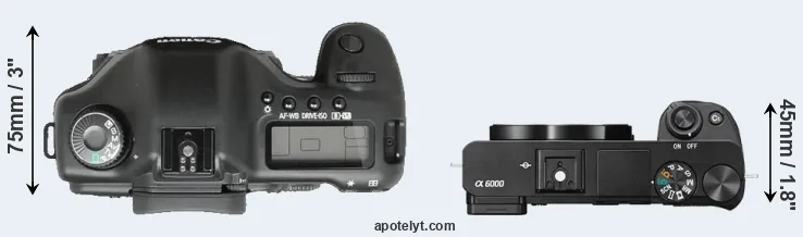 The side-by-side display below illustrates the physical size and weight of the Canon 5D and the Sony A6000. The two cameras are presented according to their relative size. Three consecutive views from the front, the top, and the rear side are shown. All size dimensions are rounded to the nearest millimeter.