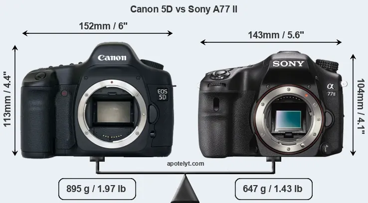 An illustration of the physical size and weight of the Canon 5D and the Sony A77 II is provided in the side-by-side display below. The two cameras are presented according to their relative size. Three successive views from the front, the top, and the rear are shown. All width, height and depth dimensions are rounded to the nearest millimeter.