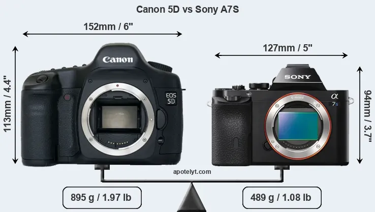 The above size and weight comparisons are to some extent incomplete since they do not consider the interchangeable lenses that both of these cameras require. Both cameras have similarly sized sensors, but DSLRs have a larger flange-to-focal plane distance than mirrorless cameras, which imposes contraints on the optical engineering process and generally leads to bigger and heavier lenses. You can compare the optics available for the two cameras in the Canon EF Lens Catalog (5D) and the Sony FE Lens Catalog (A7S). Mirrorless cameras, such as the A7S, have moreover the advantage that they can use many lenses from other systems via adapters, as they have a relatively short flange to focal plane distance.