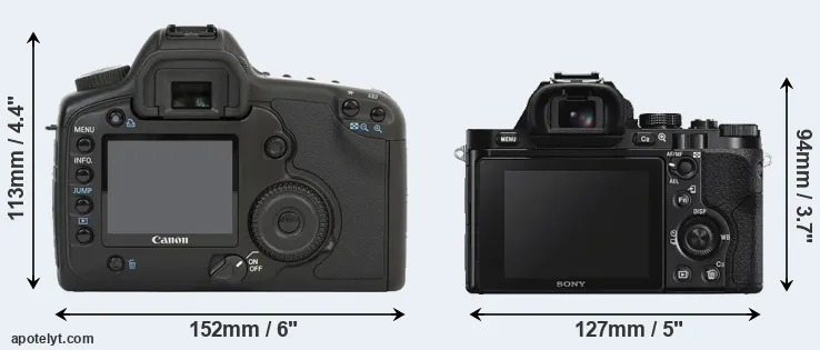 The physical size and weight of the Canon 5D and the Sony A7S are illustrated in the side-by-side display below. The two cameras are presented according to their relative size. Three successive views from the front, the top, and the rear are shown. All width, height and depth measures are rounded to the nearest millimeter.