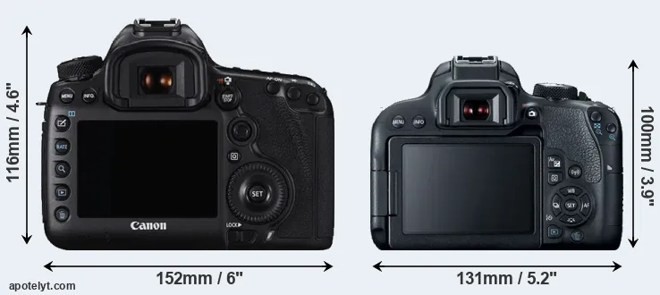 The physical size and weight of the Canon 5DS R and the Canon 800D are illustrated in the side-by-side display below. The two cameras are presented according to their relative size. Three consecutive perspectives from the front, the top, and the back are available. All width, height and depth measures are rounded to the nearest millimeter.
