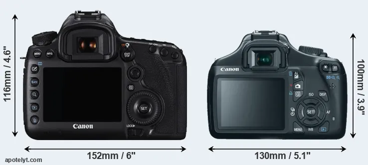 The physical size and weight of the Canon 5DS R and the Canon T3 are illustrated in the side-by-side display below. The two cameras are presented according to their relative size. Three consecutive perspectives from the front, the top, and the back are available. All width, height and depth measures are rounded to the nearest millimeter.