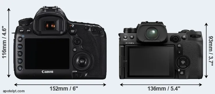 The side-by-side display below illustrates the physical size and weight of the Canon 5DS R and the Fujifilm X-H2S. The two cameras are presented according to their relative size. Three successive views from the front, the top, and the rear are shown. All width, height and depth measures are rounded to the nearest millimeter.