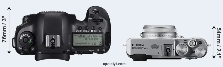 The physical size and weight of the Canon 5DS R and the Fujifilm X100 are illustrated in the side-by-side display below. The two cameras are presented according to their relative size. Three consecutive views from the front, the top, and the rear side are shown. All width, height and depth measures are rounded to the nearest millimeter.