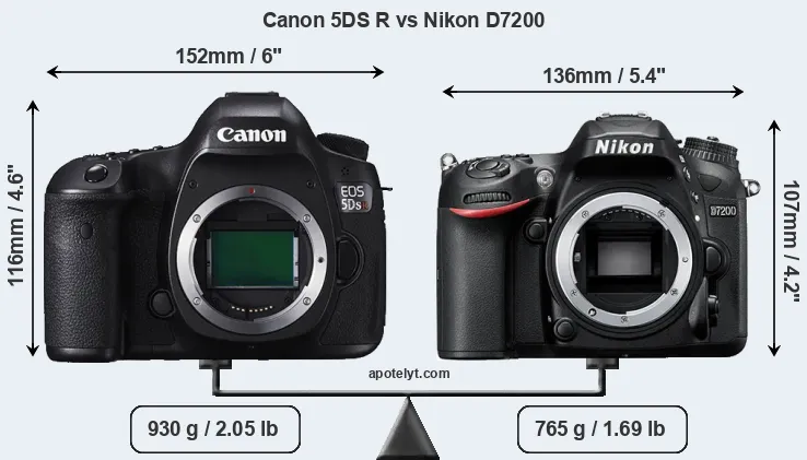 An illustration of the physical size and weight of the Canon 5DS R and the Nikon D7200 is provided in the side-by-side display below. The two cameras are presented according to their relative size. Three successive views from the front, the top, and the rear are shown. All width, height and depth measures are rounded to the nearest millimeter.