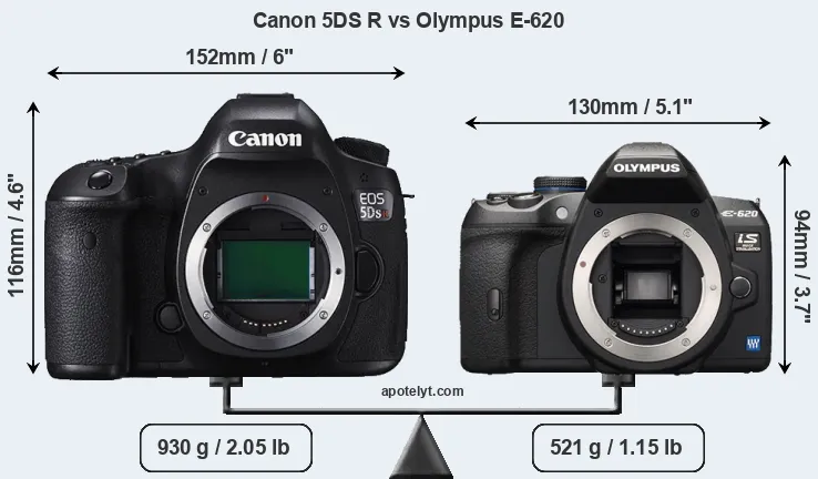 An illustration of the physical size and weight of the Canon 5DS R and the Olympus E-620 is provided in the side-by-side display below. The two cameras are presented according to their relative size. Three consecutive perspectives from the front, the top, and the back are available. All width, height and depth measures are rounded to the nearest millimeter.
